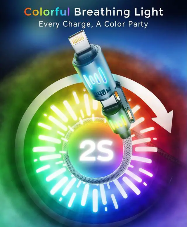 Dynamic RGB Breathing light: When this USB C Cable is charging, the RGB Breathing lights on the two connectors change color continuously. A soft colorful light, full of fashion atmosphere and not flashing eyes, easy to find in a dark environment and full of gaming atmosphere.