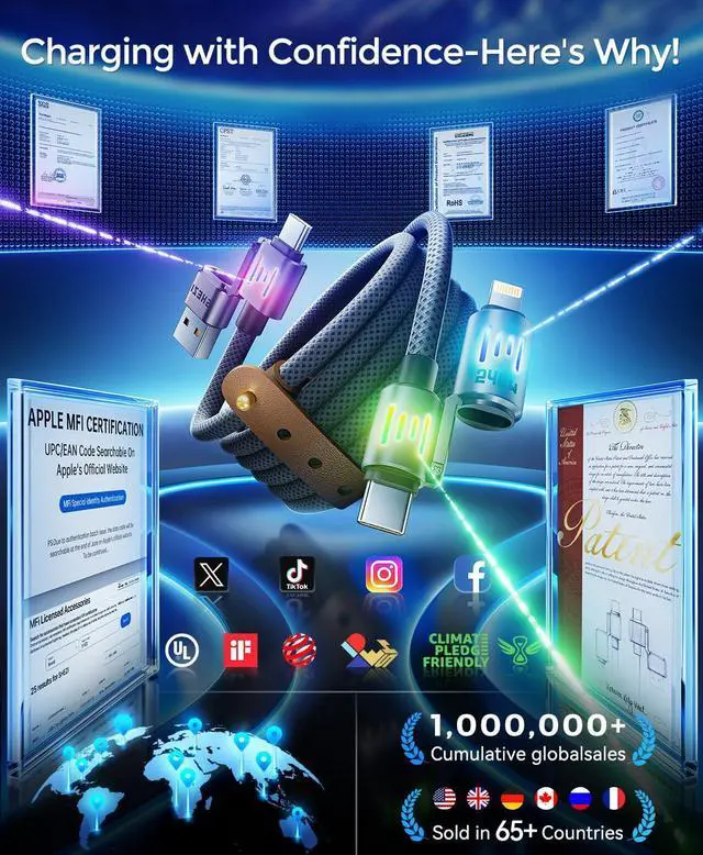Super Times 4 in 1 Charging Cable: The 4 in 1 fast charging cable provide 4 different ports combination: [USB C to USB C] [USB C to L] [USB A to USB C] [USB A to L].This phone charger cable can charge a wide range of devices, including the latest iPhone 16/15/14, iPad, Samsung Galaxy S24,MacBooks and more! You will simply be floored by its versatility. Never hunt for cables again!
