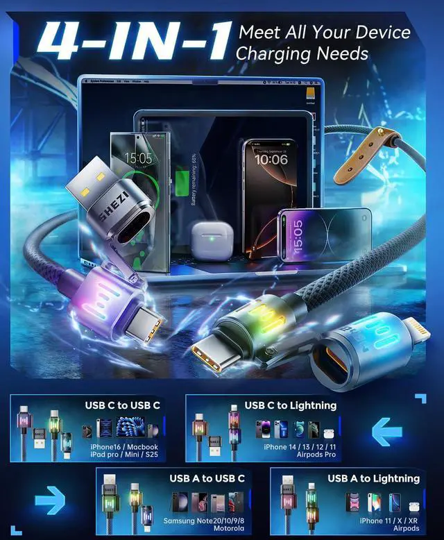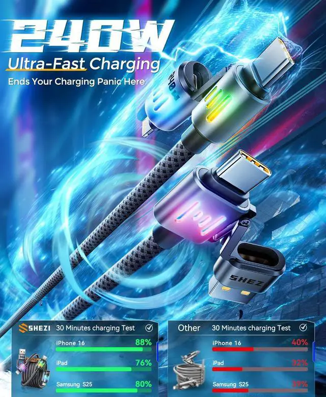 SHEZI 4-in-1 USB C Cable [240W Fast Charging & Data Transfer] Nylon iPhone Charger Cord with Light, Multi Charge Cables Combo with L/Type C/USB A Port for iPhone/iPad/Samsung, 5FT