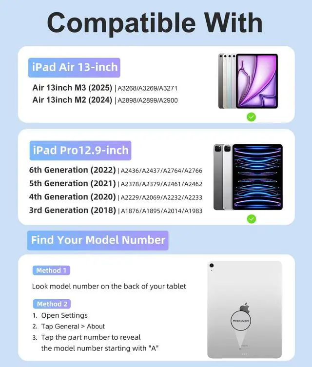 Compatibility: This keyboard case compatible with iPad Air 13 inch (M3) 2025 (Model: A3268, A3269, A3271), Air 13 inch (M2) 2024 (Model: A2898, A2899, A2900). Compatible with iPad Pro 12.9 inch 6th Generation 2022 (Model: A2436, A2437, A2764, A2766), 5th Generation 2021 (Model: A2378, A2379, A2461, A2462), 4th Generation 2020 (Model: A2229, A2069, A2232, A2233) and 3rd Generation 2018 (Model: A1876, A1895, A2014, A1983). Please check the model number starting with "A" on the back of your tablet before purchasing
