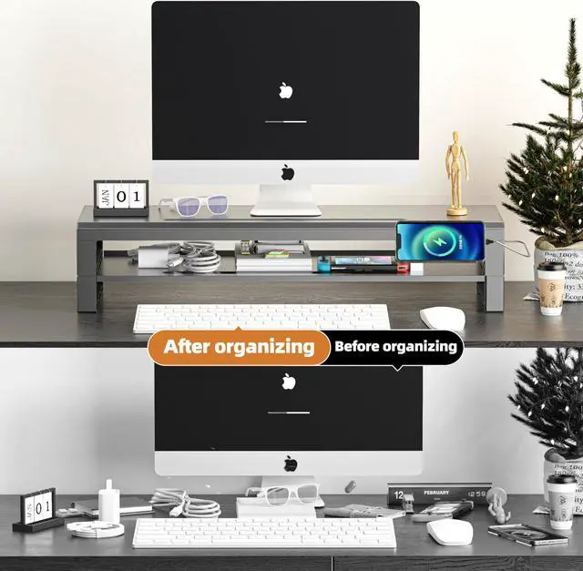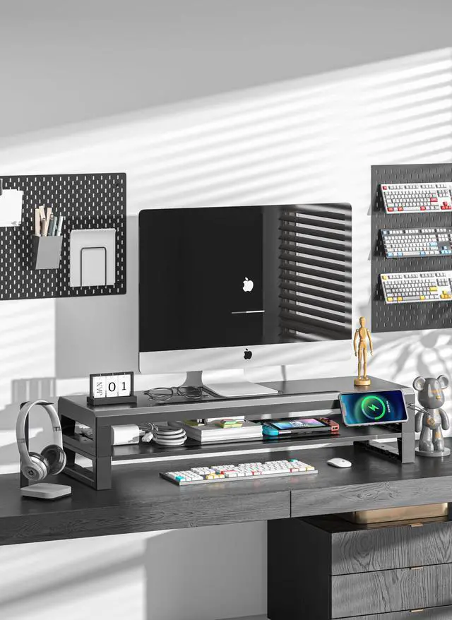 2-Tier Storage Space OrganizerThe monitor stand tube adopts a 2-tier storage design, providing ample desktop storage space. It also includes a detachable phone stand, making it convenient to store keyboards, mice, smartphones, tablets, hard disk drives, laptops, iMac, and other devices, keeping your office desk tidy and organized.