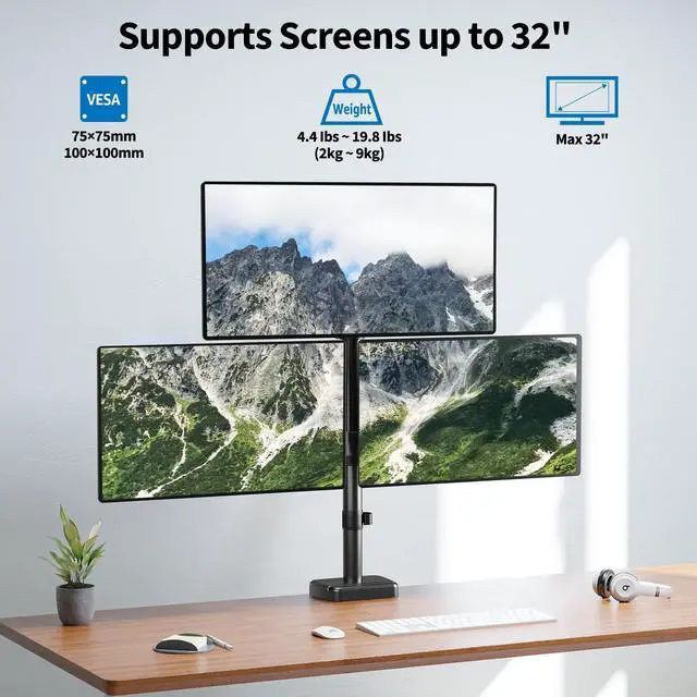 Wide Compatibility - Maximize your workflow efficiency with our triple monitor mount. Supports 3 displays from 13 to 32 flat and curved computer screen. Each arm holds up to 17.6 lbs, compatible with VESA mount 75x75mm and 100x100mm. Upgraded solid base ensuring stability and longevity, strong enough to hold three monitor displays.