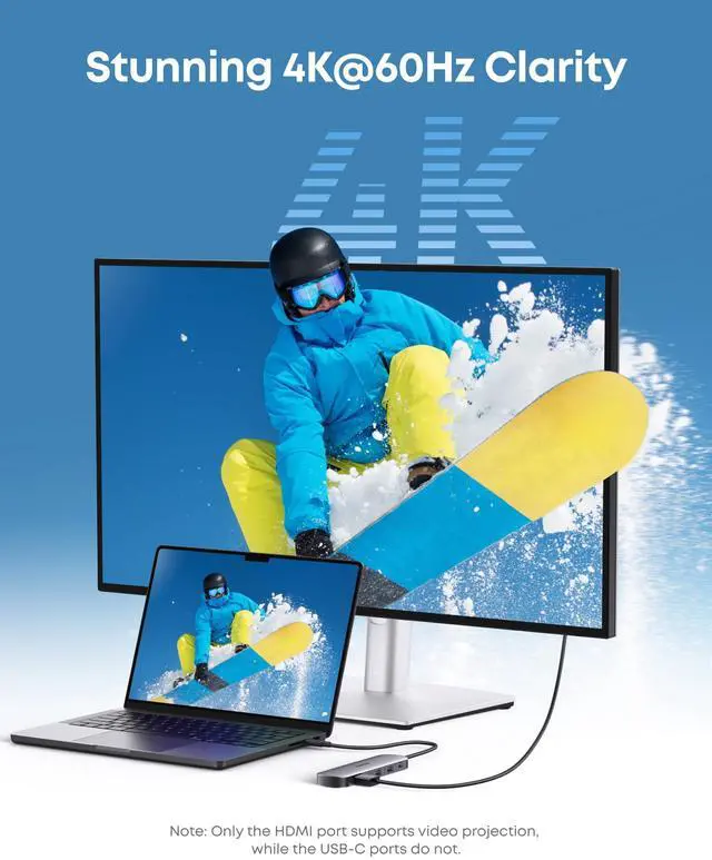 Flawless 4K@60Hz Video with HDMI: Delivers exceptional clarity and smoothness with its 4K@60Hz HDMI port, making it ideal for high-definition presentations and entertainment. (Note: Only the HDMI port supports video projection; the USB-C port is for data transfer only.)