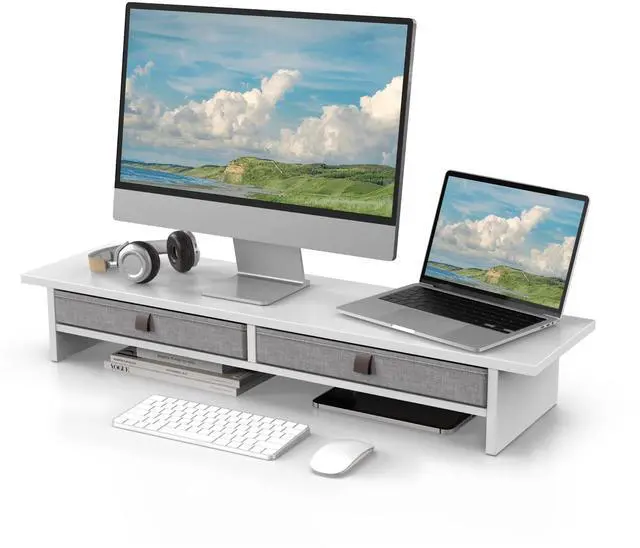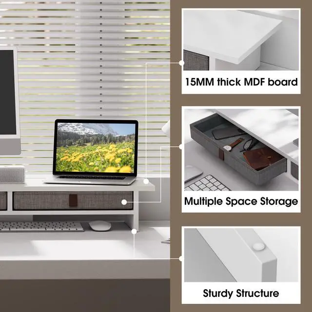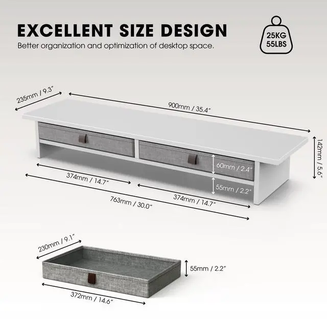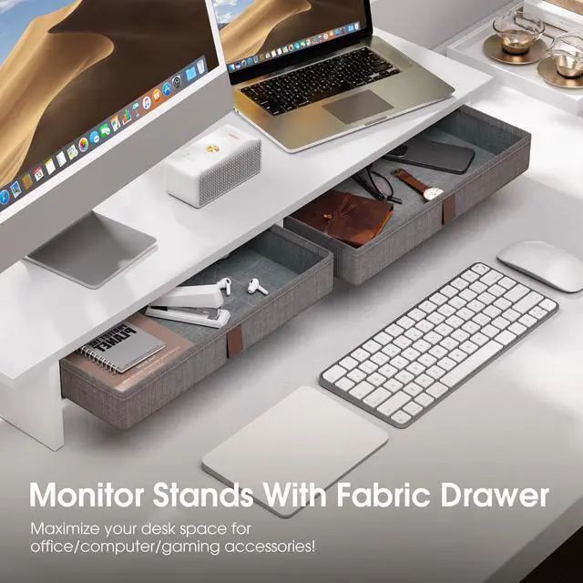 Extra Large WorkstationEquipped with 2 fabric drawers, this monitor stand effortlessly organizes cables, stationery, or office supplies, maximizing desk space while protecting privacy. The 2-tiers structure (35"x9.3") securely holds dual monitors, printers, or TVs, transforming cluttered desks into streamlined workstations.