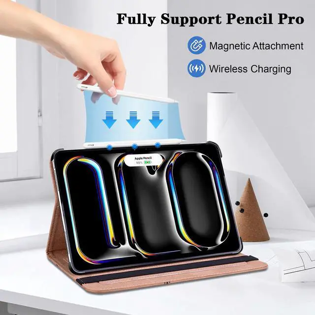 Support Apple Pencil Magnetic Attach Charging: This ipad m4 13 inch case with a recessed side groove fully supports Pencil Pro and USB-C Pencil magnetic attachment and wireless charging without taking off the ipad case.