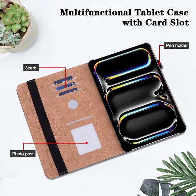 Pratical Design: The 2024 ipad pro 13 case allow to adjust multiple horizontal stand angles for watching movies or typing; ipad pro m4 case 13 built-in leather hand strap,stylus holder and two card slots/holder convenient to storage kinds of cards.