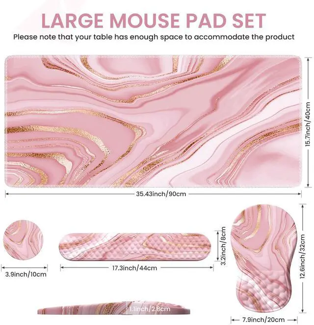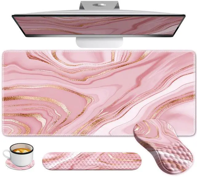 4PCS Large Mouse Pad for Desk Set: Gaming desk pad mat 35.4 x 15.7 inch, ergonomic wrist rest for computer keyboard 17.3 x 3.15 inch, rose gold mouse pad with wrist support 13x7.9x0.8inch, Cup coaster 3.9 inch
