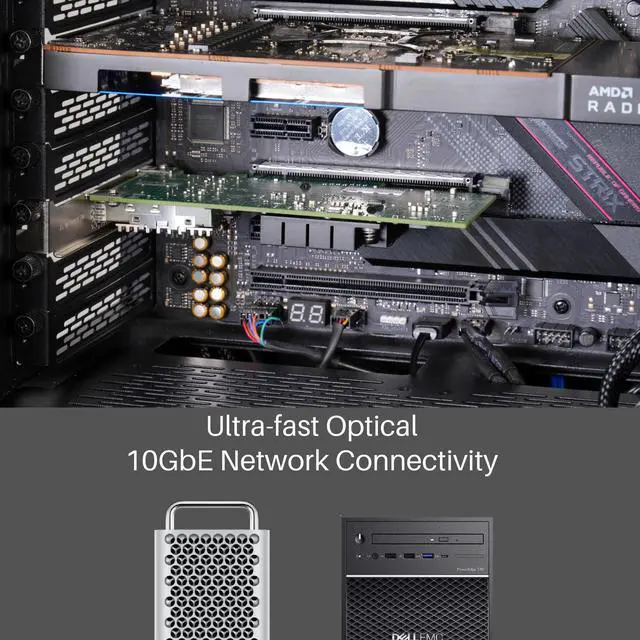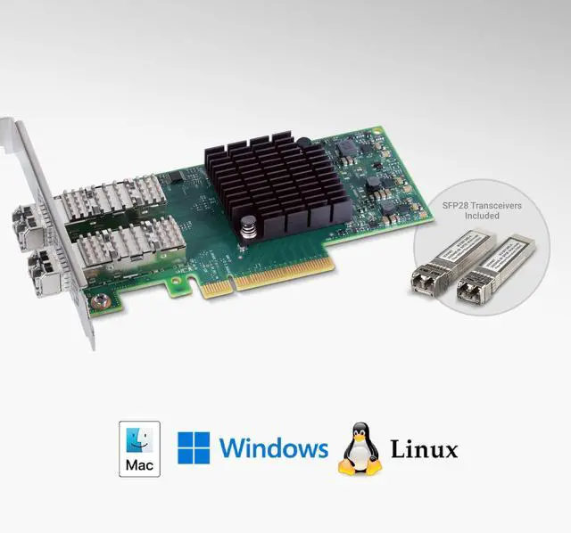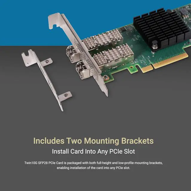 The Twin10G SFP28 PCIe Card is a Dual-port Optical 10 Gigabit Ethernet PCIe Card. Ships with Two SFP28 Transceivers, a Low-Profile Bracket and a Full-Height Bracket. Install Card Into Any PCIe Slot. Ultra-fast Optical 10GbE Network Connectivity. With increasing demands for greater data transfer speeds and more bandwidth over shared networks, and with specialized applications such as 4K video editing using high-performance shared storage systems, its no wonder that 10 Gigabit Ethernet (10GbE) use has skyrocketed this high-speed cabled networking standard offers ten times the performance of Gigabit Ethernet, the most common wired network connection included with most computers today.