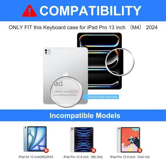 Compatibility ModelsThe iPad Pro 13 inch case 2024 with keyboard designed for New iPad Pro 13 Inch (M4) released in 2024 (Models:A2925/A2926/A3007). NOT compatible with any other iPad models.
