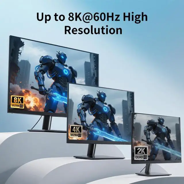 Ultra HD 8K@60Hz Resolution: : This 8K HDMI KVM switch supports resolutions up to 8K@60Hz and 4K@120Hz, providing an incredible viewing experience with stunningly lifelike images and vibrant colors. It is also backward compatible with 4K60@Hz, 1080P or lower resolutions for compatibility with various HDMI devices. NOTE: If need to achieve 8K@60Hz resolution, your computers and monitor need to support 8K resolution, and you need to use standard 8K HDMI2.1 cable with a length of less than 2 m