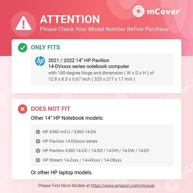 Designed to perfectly fit the 2021~2022 14" HP Pavilion 14-DVxxxx series traditional(without 360-degree hinge) Notebook Computers with dimension of 12.8 x 8.5 x 0.67 inch ( 325 x 217 x 17 mm )