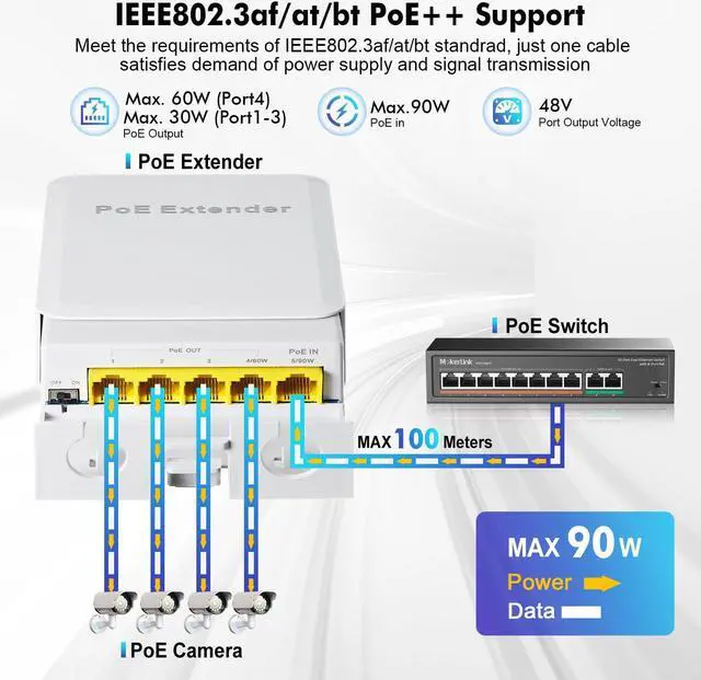 5 Gigabit PoE Ports: Include 1 PoE In, 4 PoE Out, 10/100/1000Mbps speed. POE transmission distance 100 meters.