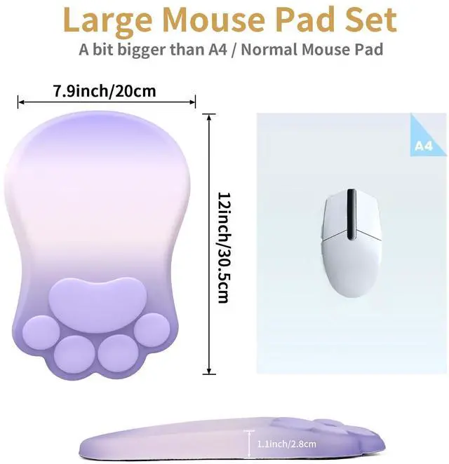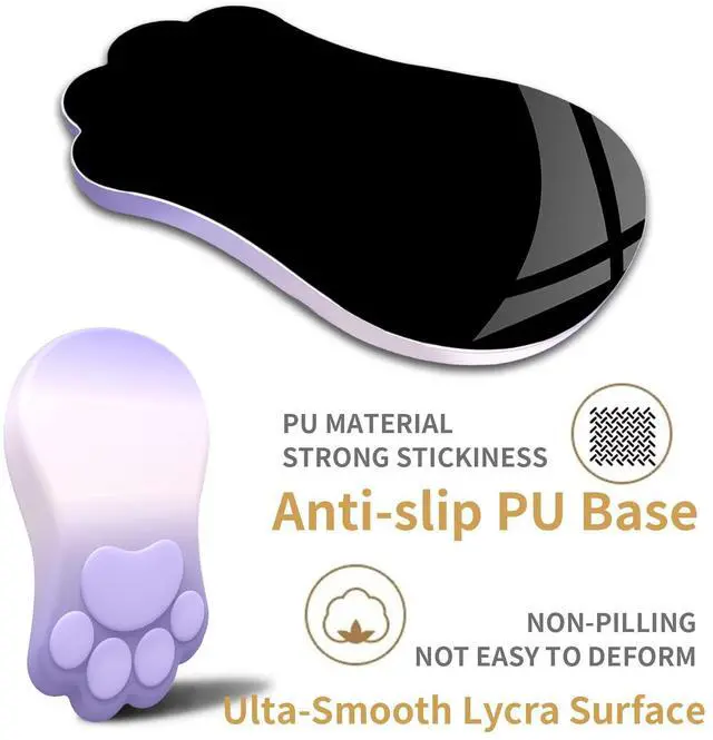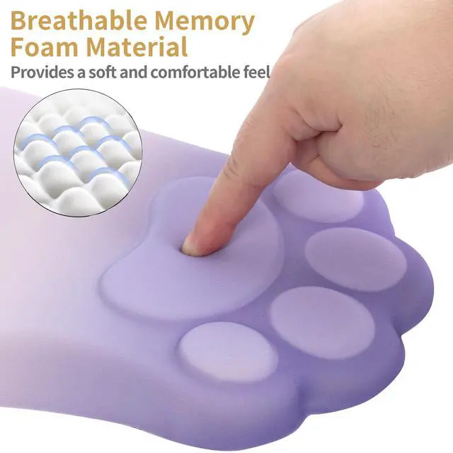 Cute Mouse Pad with Wrist RestPurple cat paw mouse pad wrist support is crafted with premium slow rebound memory foam,won't deform over time like a gel.The surface is made of silky lycra fabric,abrasion free, pilling free and comfortable to touch.Gaming mouse pad with wrist rest provide long-lasting support that ensure the wrist rest mouse pad is not easy to deform during long-term use