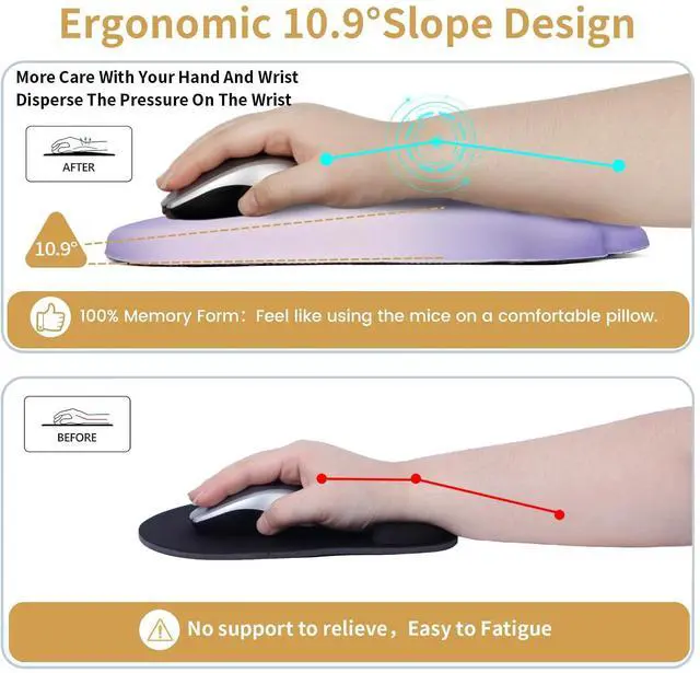 Ergonomic Cat Paw Massage DesignThe combination of cat paw inspiration and ergonomics.Cute gradient purple ergonomic mouse pad has a 10.9-degree slope ensures proper wrist alignment and massage bump design perfectly support the wrist and palm,effectively relieve wrist pain and fatigue, improve carpal tunnel syndrome (CTS).This innovative design offers superior comfort,reducing pressure and preventing carpal tunnel pain.It's your best choice of desk mouse pads