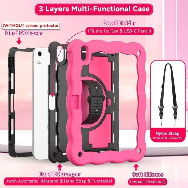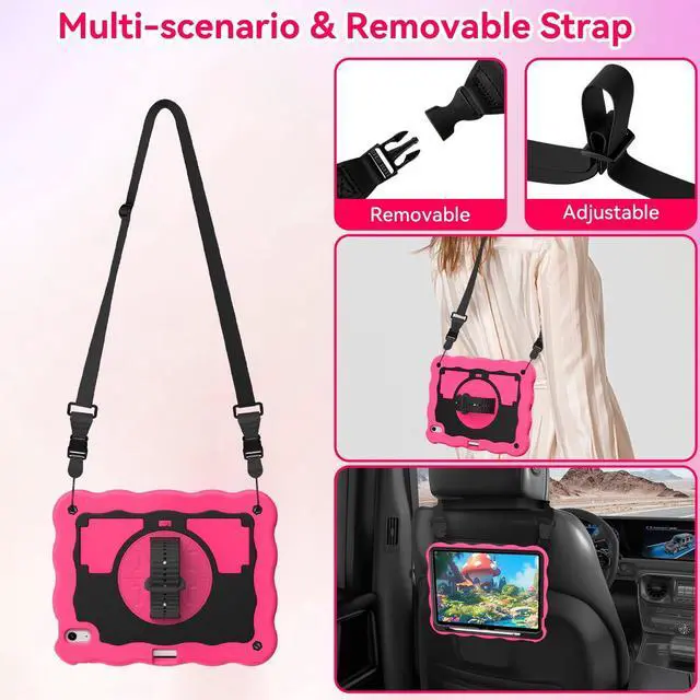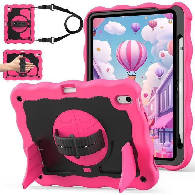 ZoneFoker for iPad A16 11th Generation 2025 / 10th Gen Case 2022, for 11 Inch / 10.9 Inch iPad Case Heavy Duty Cover Shockproof with Pencil Holder [360° Rotate Strap] & Stand for Kids, Hot Pink
