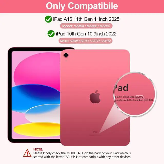 Compatibility ModelThis keyboard case compatible with iPad A16 11th Gen 11inch 2025(Model: A3354/A3355/A3356) & compatible with iPad 10th Gen 10.9inch 2022(Model: A2696/A2757/A2777/A3162). Not compatible with any other models. *Please check the model number starting with "A" on the back of your tablet before purchasing. ( NOTE: Pencil and iPad not included)