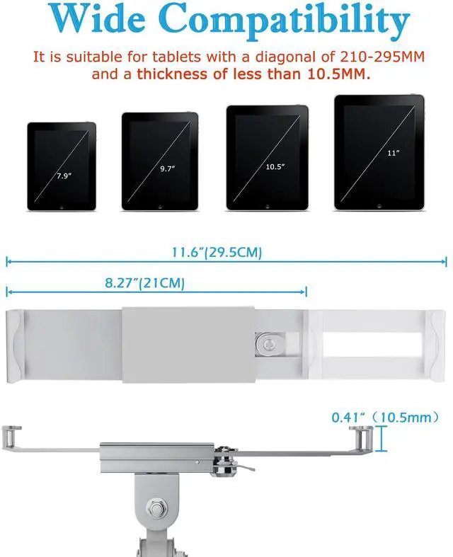 Wide Compatibility Universal hands-free tablet wall mount holder with keys fits any 7-11 display tablet. Including iPad Mini, iPad Air, iPad Pro, Microsoft Surface, Samsung Galaxy Tab, Google Pixel Slate and Amazon Fire.