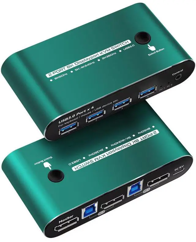 2 Port KVM Displayport 165hz: KVM Switch Displayport 2 Computers 1 Monitor sharing one set of keyboard & mouse, 1 DP2.0 or DP 1.4 monitor, and 2 pcs USB 3.0 peripheral devices. 2 pcs USB 3.0 hub (data transferring rate up to 5Gbps/s ,10 times faster than USB 2.0), 2 kits cables and a wire remote push button switch@144Hz,3840*1080@240Hz,and the lower resolution is not recommended . Drive-free for Windows 10/7/2000/XP/Vista, Linux, Mac