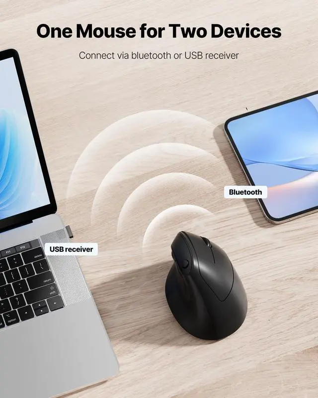 Connect 2 Devices Simultaneously-This ergonomic wireless mouse supports Bluetooth 5.0 and 2.4GHz USB-A modes, allowing you to connect up to 2 devices at a time and switch between them with a simple press. Compatible with Windows 7/8/10/11 or higher, Mac OS 10.12 or higher, and Android 4.3 or higher