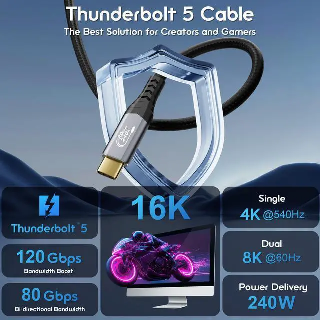 Thunderbolt 5 cable, 80Gbps high-speed transmission, directional bandwidth up to 120Gbps, supports 16K dual 8K HD video output, easily enabling multi-screen connectivity. 240W high-power charging, compatible with Thunderbolt 4/3, USB4 v2.0, and other devices, suitable for daily office, entertainment, and multi-scenario use.