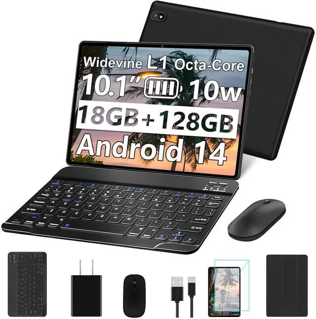 DMOAO 2025 Tablet Android 14 Tablets with 128GB ROM+18GB RAM, 1TB Expand 2 in 1 10.1 Inch Tablet with Keyboard, Powerful Octa-Core, WiFi 6, BT 5.0, 6000mAh, Widevine L1, Black