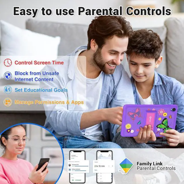 AUTO-BLOCK UNSAFE CONTENT WITH GOOGLE FAMILY LINK - Parental controls filters 18+ sites, set "homework mode" blocking games. Approve 15+ kids-friendly educational apps (pre-installed) and creativity tools designed by the Academy Learning Experts (Worth more than $150.00) grows with kids aged 3-12.