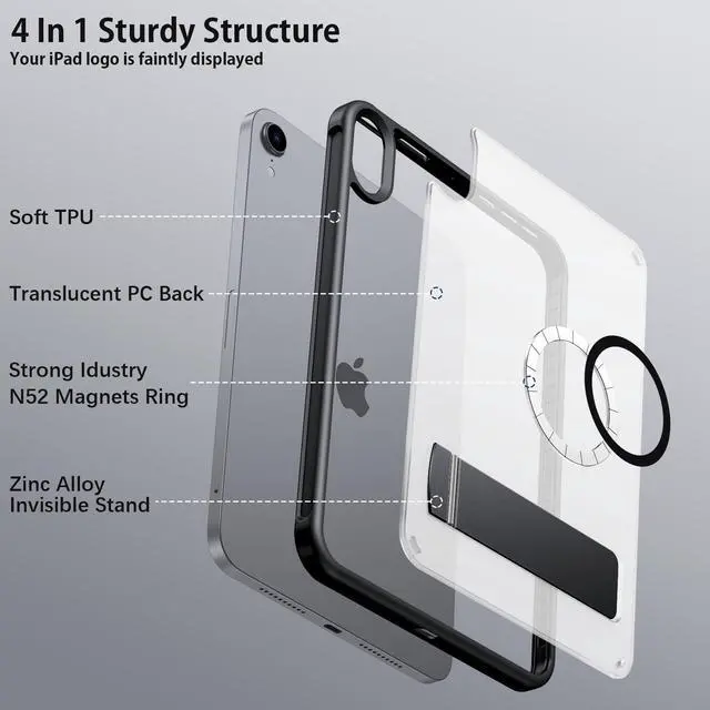 Magnetic Ring for More Usage scenariosThis magnetic case for iPad Mini 7/iPad Mini 6 is equipped with industrial-grade N52 high-strength magnets, allowing for multiple scenarios. Your iPad can be used in all angles on metal surface and magnetic stands, such as fridge, car mount, magnetic tripod mount and magnetic iPad stand, ect. (Note!!! Not for Magsafe charging!!)