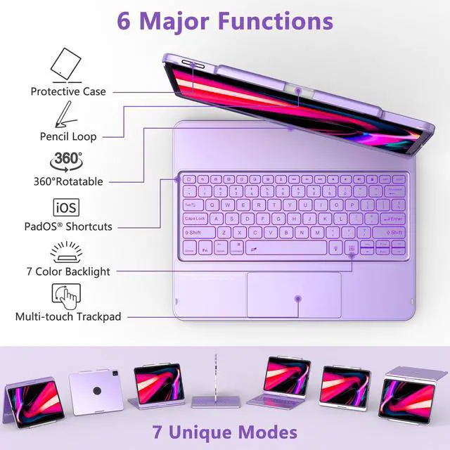 TQQ iPad Air 13 Inch Case Keyboard (M3 2025 / M2 2024), iPad Pro 12.9 (6th, 5th, 4th, 3rd Gen) Keyboard - 360° Rotatable, 7-Color Backlight, Multi-Touch Trackpad, Thin & Light (Purple)
