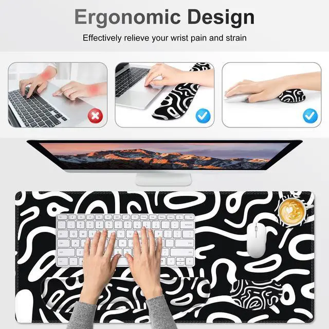 • WRIST REST FOR COMPUTER KEYBOARD: The wrist rest pad of desk mat set filled with memory foam is ergonomic and perfectly fits the wrist, providing effective support and a comfortable touch for both the keyboard and mouse. This helps to keep the wrist and hand relaxed, reducing the stress of prolonged computer use in an office environment, and minimizing discomfort and soreness.