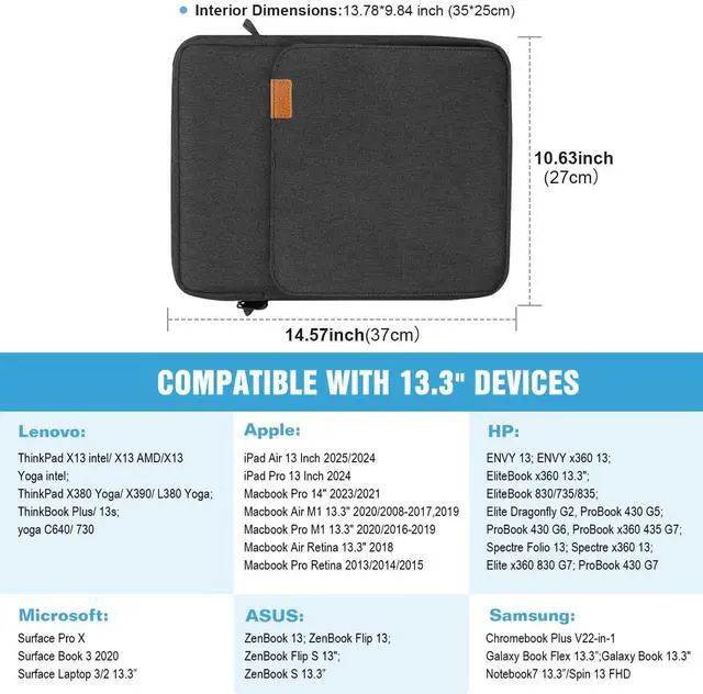 Fit for - Designed for 13.3-14 inch Laptops and tablets and fits smart keyboard. Fit for iPad Air 13 Inch 2024, iPad Pro 13 Inch 2024,Surface Pro 9/8/X/7/6/5/4/3, MacBook Air 13 2018-2022(A2179/A1932), MacBook Pro 13 2016-2022(A2251/A2289/A2159/A1989/A1706/A1708), iPad Pro 12.9 Inch 2022/2021/2020/2018, Galaxy Tab S9+/S8+, Galaxy Tab S7+, IdeaPad 710S/720S 13.3", HP Elitebook X360 13.3", HP Envy 13, Dell XPS 13", etc. NOT compatible with MacBook Air 13 2010-2017 and MacBook Pro 13 2008-2015.