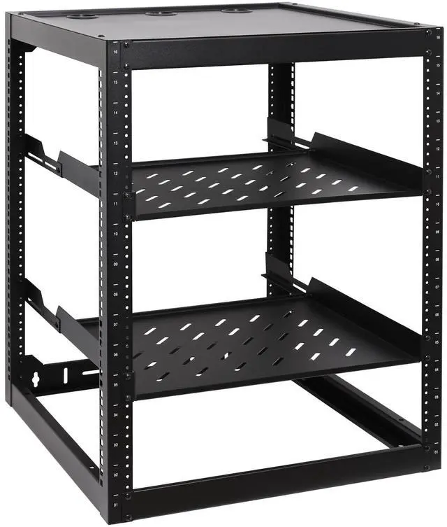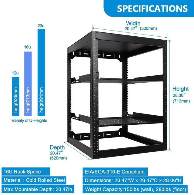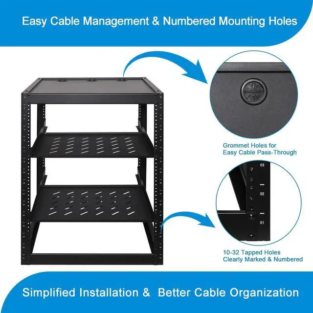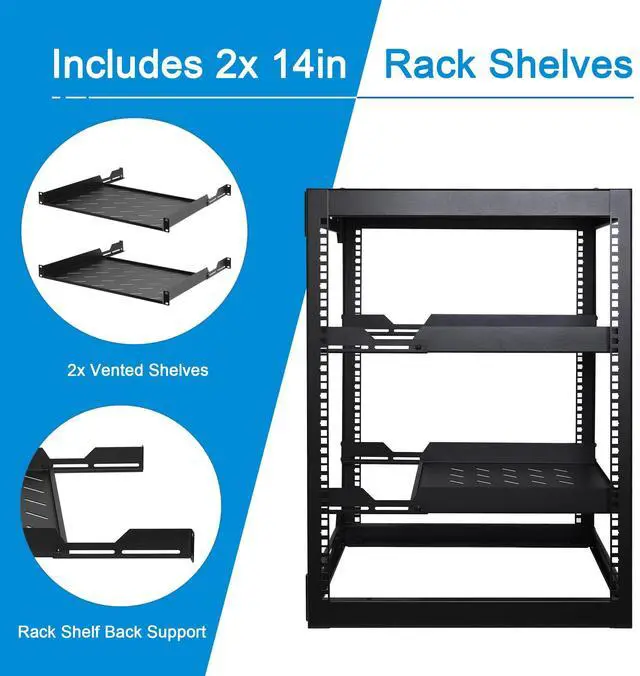 Maximize your network setup with the RackPath Open Frame Server Rack a versatile and durable solution for organizing your IT, AV, or telecom equipment. Built with premium cold-rolled steel and finished with a sleek black powder coating, this open frame rack offers both wall-mounted and floor-standing installation, adapting seamlessly to home labs, server rooms, or office closets. The included accessories 2× 1U vented shelves, a full set of 10-32 screws plus wall mounting screws ensure you're ready to mount switches, patch panels, modems, DVRs, or routers right out of the box.