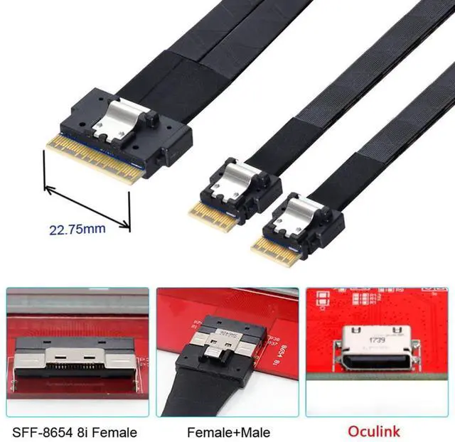 This cable can be used to connect internal devices, e. g. a backplane with Slim Line 8654 74pin connector to a controller with oculink SFF-8611 connector.