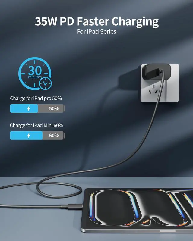 35W Fast Charging for New iPad Series: Enjoy fast charging with 35W Max output for your iPad Pro, iPhone 17, and other USB-C devices. Charge for your iPad 11th up to 50% in just 30 minutes, 5X Fast charging speed, help you work efficiently