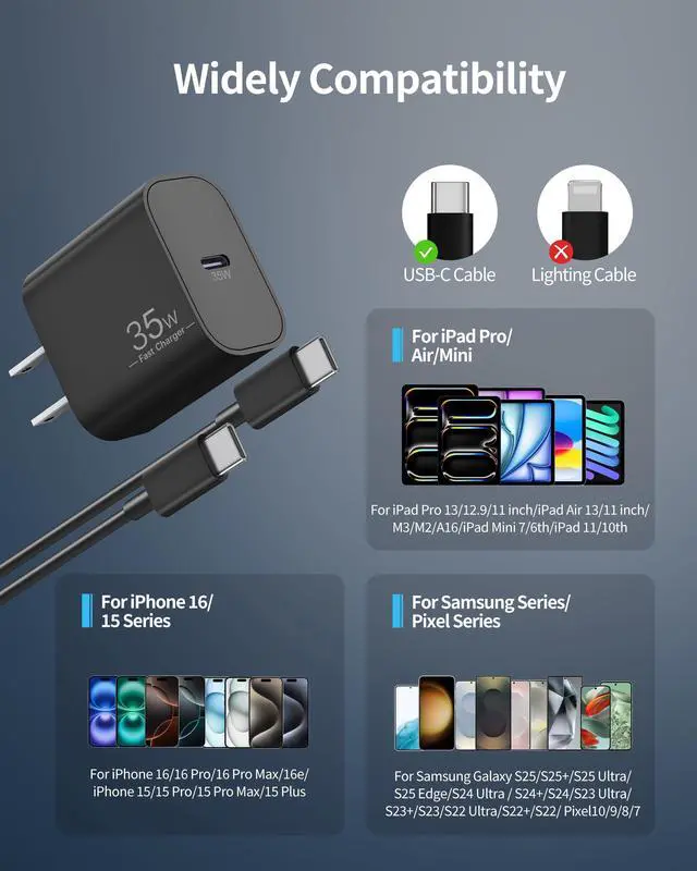 Widely Compatibility: 35W USB C Fast wall charger for iPad Pro 13/12.9/11 inch 2025-2018, iPad Air 13/11 inch 2025 Air 5th, iPad 11th/10th Generation, iPad Mini 7th/6th, iPhone 17/17 Pro/17 Pro Max/Air/16e/16/16 Plus/16 Pro/16 Pro Max/15/15 Plus/15 Pro/15 Pro Max, AirPods Pro 3 2, MacBook Air, and also fast charge for Galaxy S25/S24/S23/S22, Google Pixel 10/9/8/7/6/5, LG, Moto, Tablets, Android Phones and more