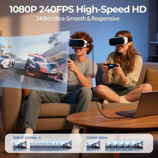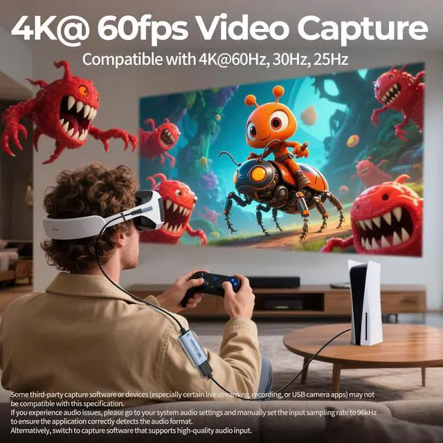 4K 60FPS Input & Output with Ultra-Low LatencyThis HDMI 4K video capture card with a 90° USB-C connector and 3.3ft (1M / 100cm) cable supports up to 4K@60Hz input and output through USB 3.0, delivering smooth, vivid visuals for high-motion gameplay, VR capture, or iPad content. The right-angle design is ideal for Quest 3, Quest 3s, and other VR headsets, minimizing cable stress in tight spaces. Includes a USB-A male to USB-C female adapter, supporting connection via both USB-A and USB-C ports for maximum flexibility