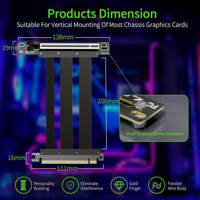 PCIE 5.0 X16 Riser Cable: Compliant with PCIE 5.0 design specification, and actual test speed (50-55GBs) meets requirements (PCIE 5.0 X16 Theoretical speed = 64GBs at max). Backward compatible with PCIE 4.0/3.0