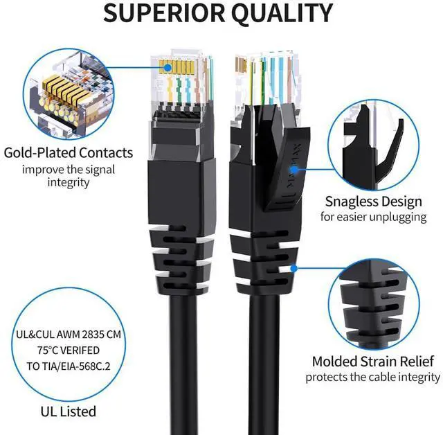 Compatibility: RJ45 Ethernet patch cable with standard size RJ45 connectors(0.905*0.454*0.315 inch), which can plug in and out more efficient, provides universal connectivity for LAN network components such as PCs, laptop, computer servers, printers, routers, switch boxes, network media players, NAS, VoIP phones, etc.