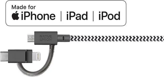 Native Union Belt Cable Universal - 6.5 ft Ultra-Strong Reinforced [MFi Certified] Durable Charging Cable with 3-in-1 Adaptor for Lightning, USB-C and Micro-USB Devices (Zebra)