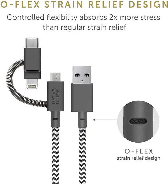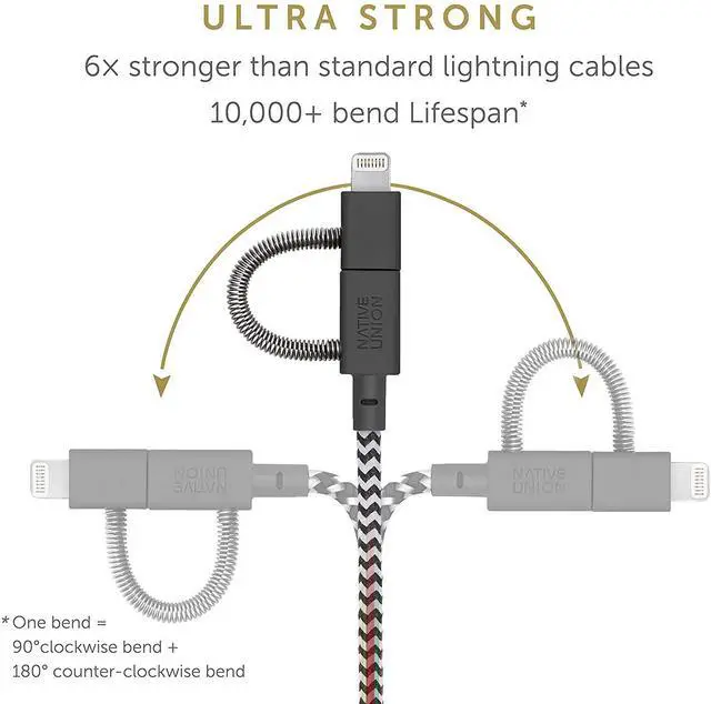 EXTENDED LIFESPAN: O-Flex strain relief design at connector joint provides controlled flexibility to absorb 2 x more stress than regular strain relief. Its 10,000+ bend lifespan makes it 6x stronger than standard Lightning cables