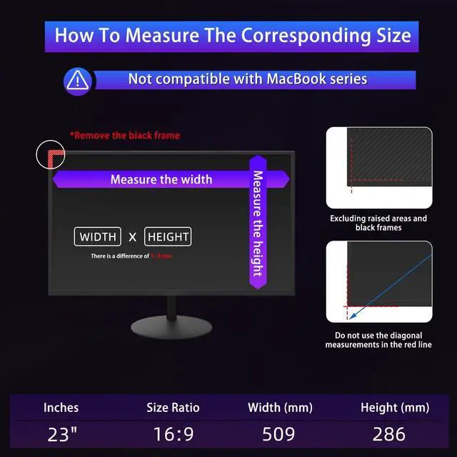 Compatible Dimensions23 inch Privacy Screen filter 16:9 Aspect Ratio Dimensions as followed:Width: 20.03 inch (509 mm), Height: 11.25 inch (286 mm). NOTE: The filter size may vary by 1-3 mm from the listed size, but this will not affect installation or normal use