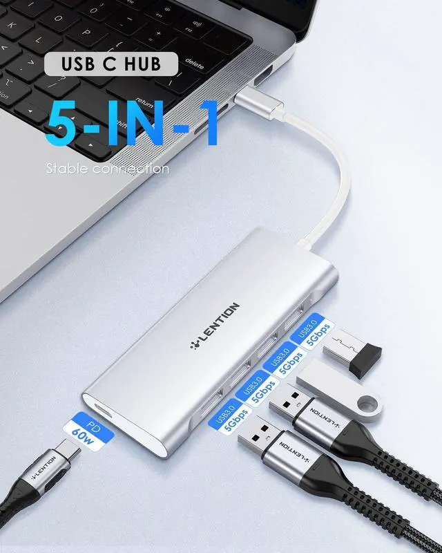 LENTION USB C Hub with 4 USB 3.0 & Type C Charging Compatible 2025-2016 MacBook Pro, New Mac Air, New Surface, Chromebook, More, Stable Driver Certified Type C Multiport Adapter (CB-C31, Silver)