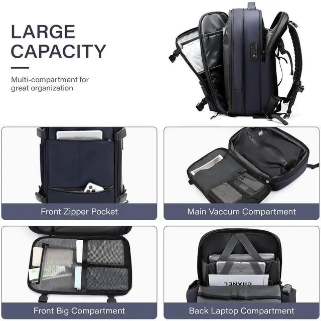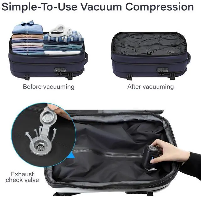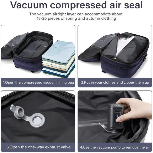 Vacuum Compression SystemThe travel backpack with vacuum system saves 80% on clothes storage space, reduces the bulk of your packed clothes, and maximizes packing efficiency. With a one-way outlet valve, you can opt for manually press to release air or vacuum pump for quicker compression. Note: The vacuum seal compartment has an AIR-TIGHT zipper, which is quite tight and requires extra force to pull,lf the pump does not work, please charge it and try again.