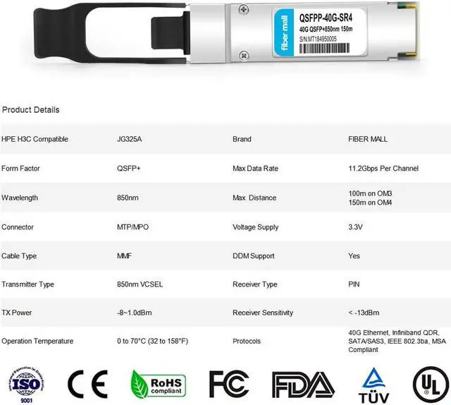 Temperature range: 0°C to 70°C RoHS Compliant Part ApplicationsHPE H3C JG325A Compatible 40GBASE-SR4 QSFP+ Optical Transceiver Module for Ethernet and Data Center Rack to rack Data centers Metro networks Switches and Routers Infiniband 4x SDR, DDR, QDR 40GBASE-SR4 40G Ethernet Breakout to 4 x 10GBASE-SR Ethernet Proprietary interconnectionsPackage1*sfp dust cover1 *pair 40Gbps SR4 fiber transceiver module 1* package box
