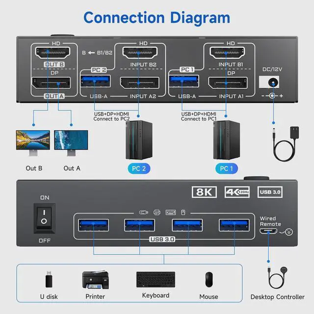 KVM Switch 2 Monitors 2 Computers 4K@144Hz 8K@60Hz, HDMI Displayport Dual Monitor KVM Switch for 2 PC Share 2 Monitors Keyboard Mouse Printer, Wired Remote, Power Adapter and USB Cable Included