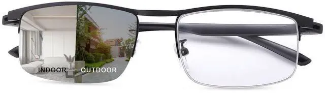 Photochromic LensPhotochromic Sunglasses lens will change from clear to black in response to the intensity of the ultraviolet, also with high transmittance (93%).Effectively maintain a suitable brightness to protect your eyes in strong sunshine.The darkness of lens color depends on UV intensity!Indoors, you can wear it as anti-blue light glasses: Filter high level blue light from digital screen of computer, phone and TV.Outdoors, you can use it as sunglasses.