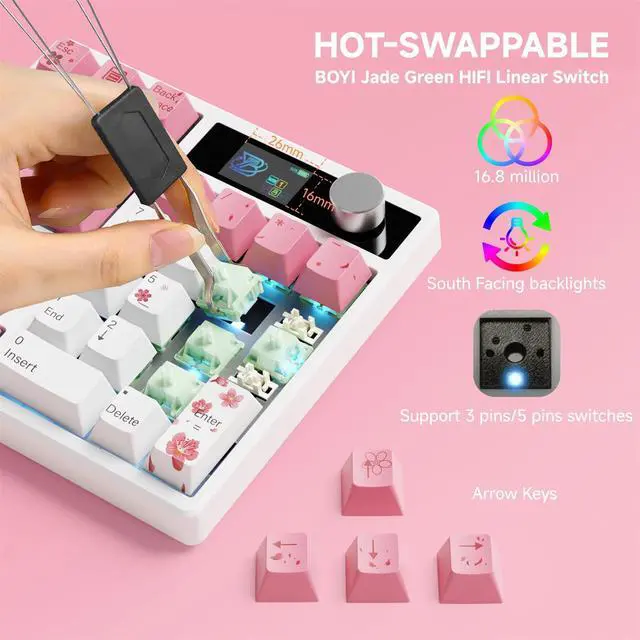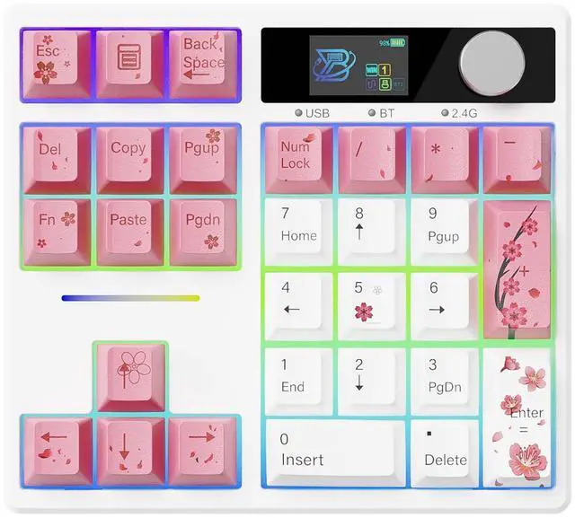ZMX X BOYI TD31Pro Mechanical Numpad, Hot Swap Wireless BT 5.0 / 2.4GH z/Type-C Wired Numeric Keypad with Screen&Knob, 30Keys PBT Keycaps RGB Gaming Macro Number Pad for PC Laptop (Pink Cherry Blossom)