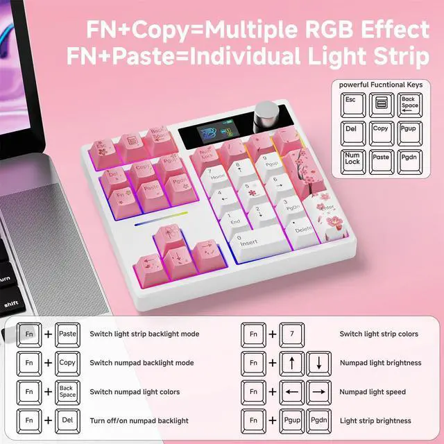 ZMX X BOYI TD31Pro Mechanical Numpad,Hot Swap Wireless BT5.0/2.4GHz/Type-C Wired Numeric Keypad with Screen&Knob,30Keys PBT Keycaps RGB Gaming Macro Number Pad for PC Laptop (Pink Cherry Blossom)