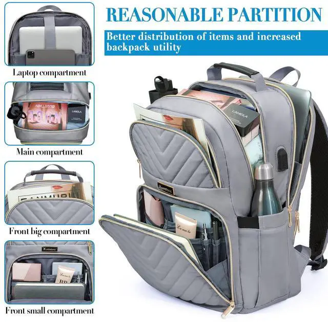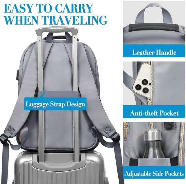 Fashion Grey & Gold Water-resistant Material: Grey backpack for women is made of fashion stitch texture polyester waterproof fabric and gold-plated zipper on the outside, and tear-resistant material on the inside for durability. The top of the Laptop backpack is equipped with a comfortable PU leather handle, which is easy to carry and adds a fashion feel.