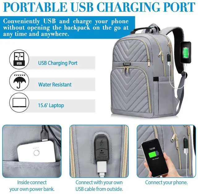 USB Charging Port : With an external USB charging port and built-in a charging cable inside, and there is a special pocket inside the laptop backpack to place the power bank (Note: power