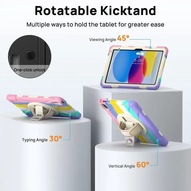 [Rotating Stand and Hand Strap]: The 360° Rotating Stand provides multi-angle viewing and typing and newly upgraded buttons allow you easily close the stand. Adjustable hand strap helps you securely hold the iPad 10th case with one hand, Convenient for traveling, working, or playing with your kids